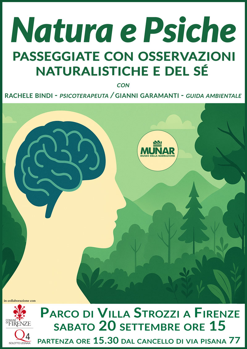 Sabato 20 settembre alle ore 15 il Parco di Villa Strozzi a Firenze diventerà il teatro di un evento che intreccia natura e introspezione: “Natura e Psiche – Passeggiate con osservazioni naturalistiche e del sé”. L’iniziativa, organizzata dal Museo della Narrazione (MUNAR) in collaborazione con il Quartiere 4, prevede una camminata esperienziale guidata dalla psicoterapeuta Rachele Bindi e dalla guida ambientale Gianni Garamanti.