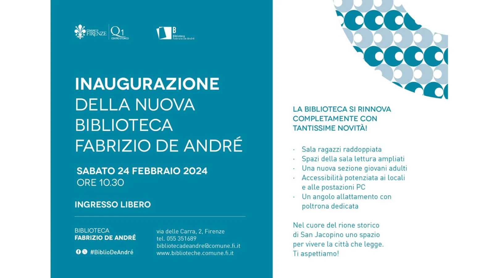 Sabato 24 febbraio verranno inaugurati i locali rinnovati della Biblioteca Fabrizio De André