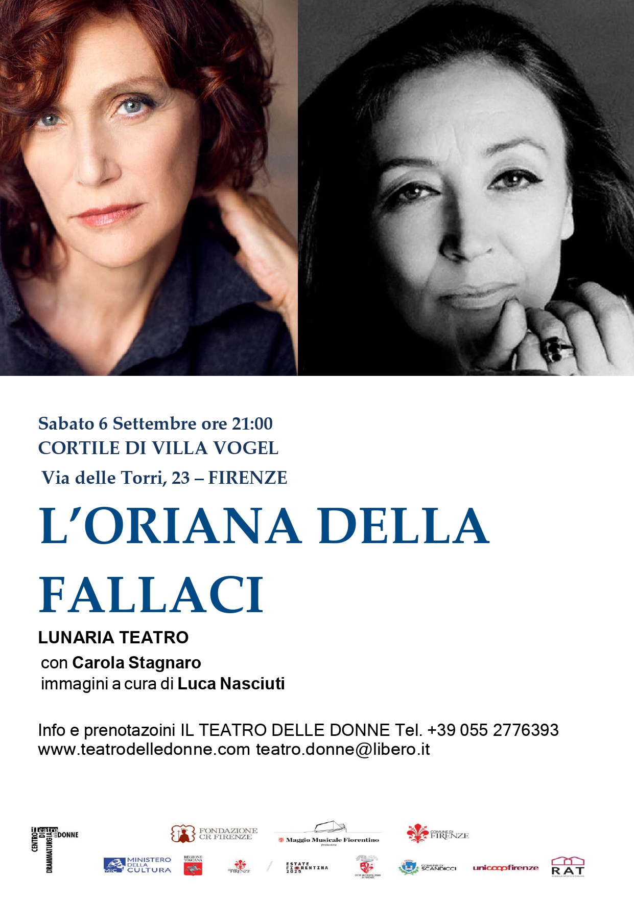 Il 6 settembre alle ore 21, nel Cortile di Villa Vogel, va in scena L’Oriana della Fallaci di Lunaria Teatro, con Carola Stagnaro e la cura di immagini e suoni di Luca Nasciuti e Stefano Gualtieri.