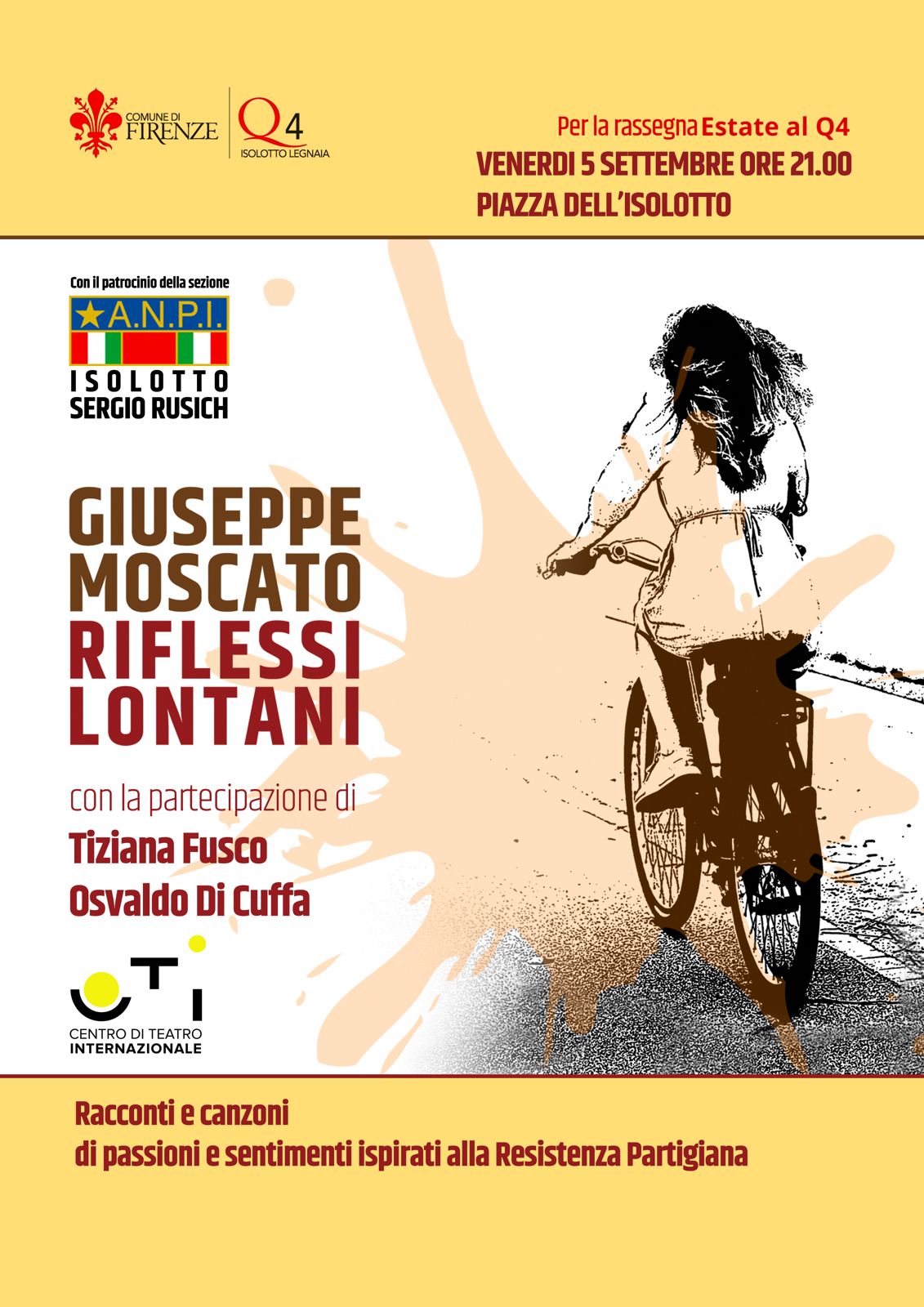 La rassegna Estate al Quartiere 4 si arricchisce di un appuntamento speciale: venerdì 5 settembre 2025, alle ore 21.00, in Piazza dell’Isolotto andrà in scena “Riflessi Lontani”, un evento che intreccia musica e narrazione per rendere omaggio alla memoria della Resistenza Partigiana.