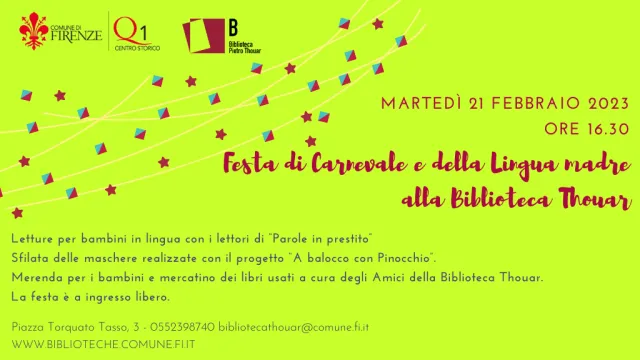 Martedì 21 febbraio dalle 16.30 alla Biblioteca Thouar letture, sfilata in maschera, merenda per bambini e mercatino dei libri usati