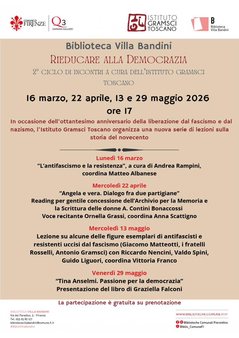 L'Istituto Gramsci Toscano promuove una serie di incontri presso la Biblioteca Villa Bandini per approfondire le vicende cruciali del secolo scorso, dalle guerre mondiali alla Resistenza, fino al dramma della Shoah. Il primo appuntamento è dedicato all'Antifascismo e alla Resistenza, con l'obiettivo di trasmettere i valori democratici attraverso la conoscenza storica.